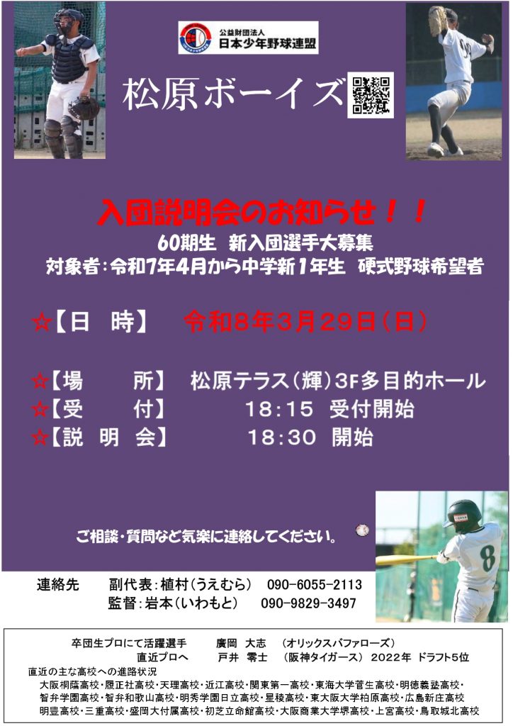 ★松原ボーイズ60期生入団説明会のお知らせ★